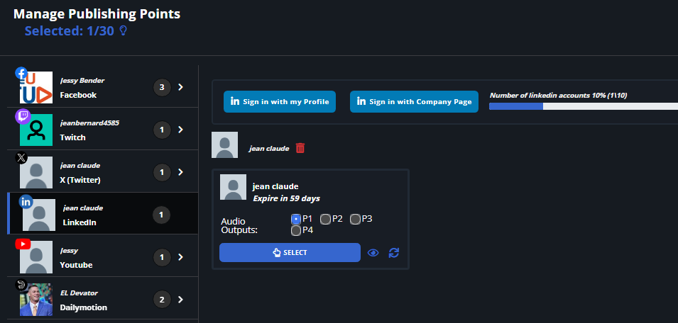 - Select your LinkedIn account on LiveU Studio (7) (Choose between your Company or Profile page).