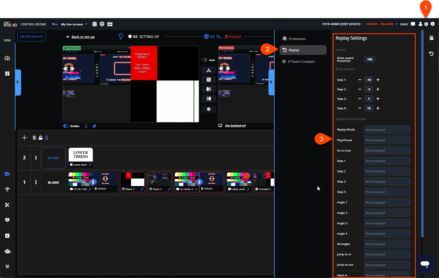 - Enable the "Take over preview" option in the replay settings in order for the replay operator to have control on the production preview from the external tab. (1 to 3)