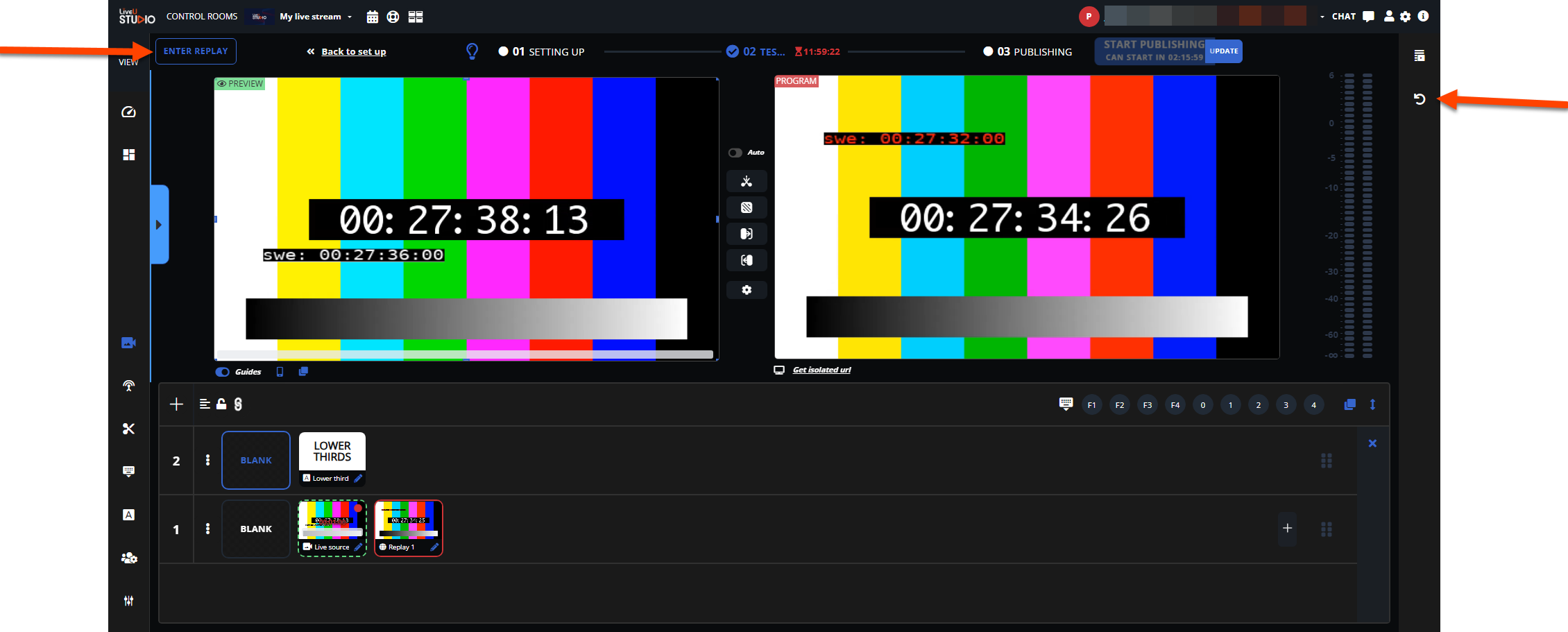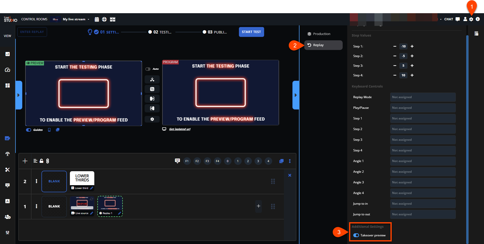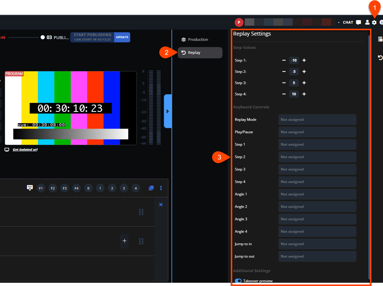 リプレイオペレータが外部タブから制作プレビューを制御できるようにするには、リプレイ設定内