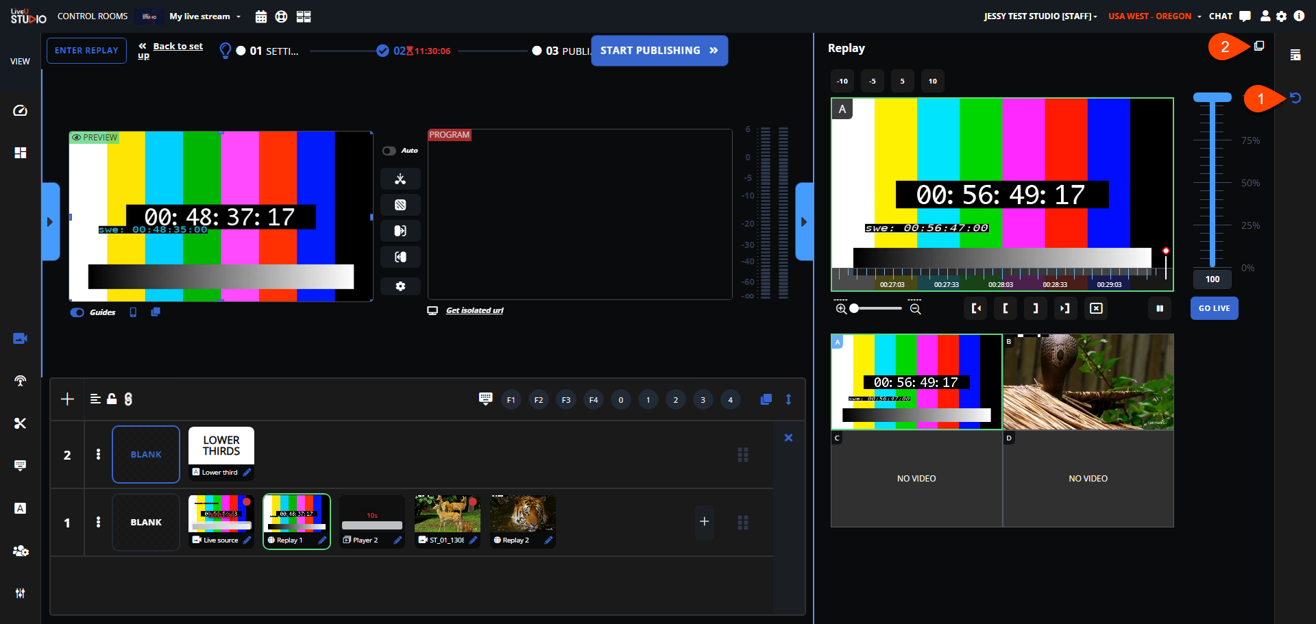 - LiveU Studio内のリプレイプレーヤータブに移動します。このタブには、使用するカメラアングルの選択や再生スピード・位置の調整など、リプレイを管理するための専用インターフェースがあります。
