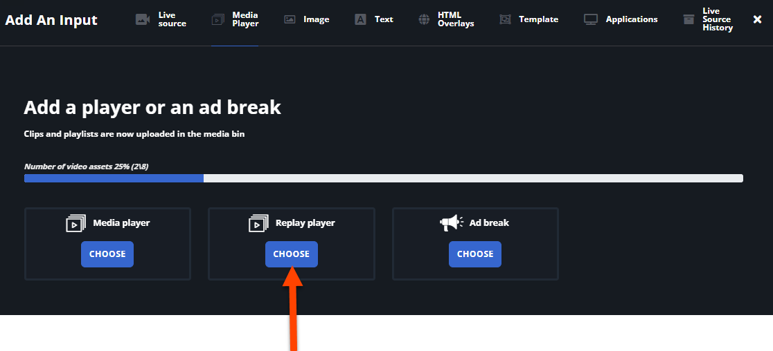 追加するプレーヤー/アングルの数を選択し、ライブ入力映像ソースを割り当てます。